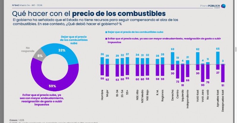 El 59% cree que la decisión del gobierno de subir el precio de los combustibles era evitable y 43% cree que el estado tiene recursos suficientes para financiar sus compromisos. Además, sólo el 33% piensa que el Estado está enfrentando una situación crítica, argumento que está usado el gobierno para justiciar las alzas.