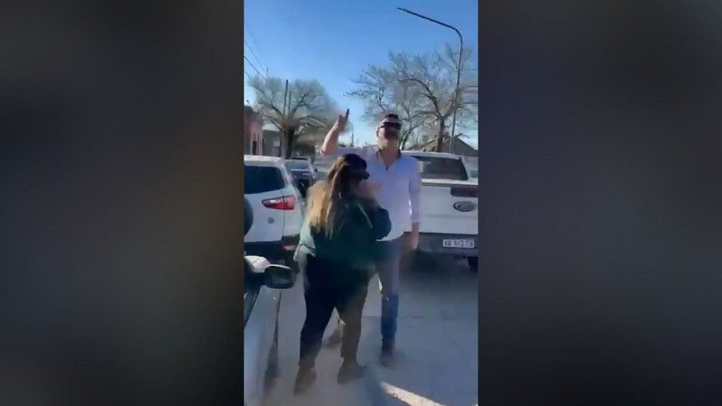 Raitelli se pone serio y contesta con un frase que parece sacada de No habrá más penas ni olvidos: “Yo soy el intendente del pueblo”, dice y le ordena a su personal llamar a la policía. Ahí es cuando la situación se desbanda. Se pueden ver algunos manotazos, empujones y patadas
