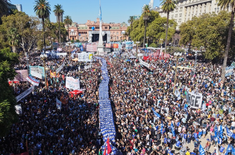 Las organizaciones de derechos humanos estimaban que la convocatoria superó incluso la de mayo de 2017 contra el fallo del 2×1 de la Corte Suprema, cuando cerca de medio millón de personas coparon el centro porteño. Esta vez, la plaza se volvió por momentos irrespirable, colmada por una marea humana que desbordó todas las diagonales y avenidas, en una postal que volvió a poner a los libertarios en clara desventaja en lo que llaman la “batalla cultural”.