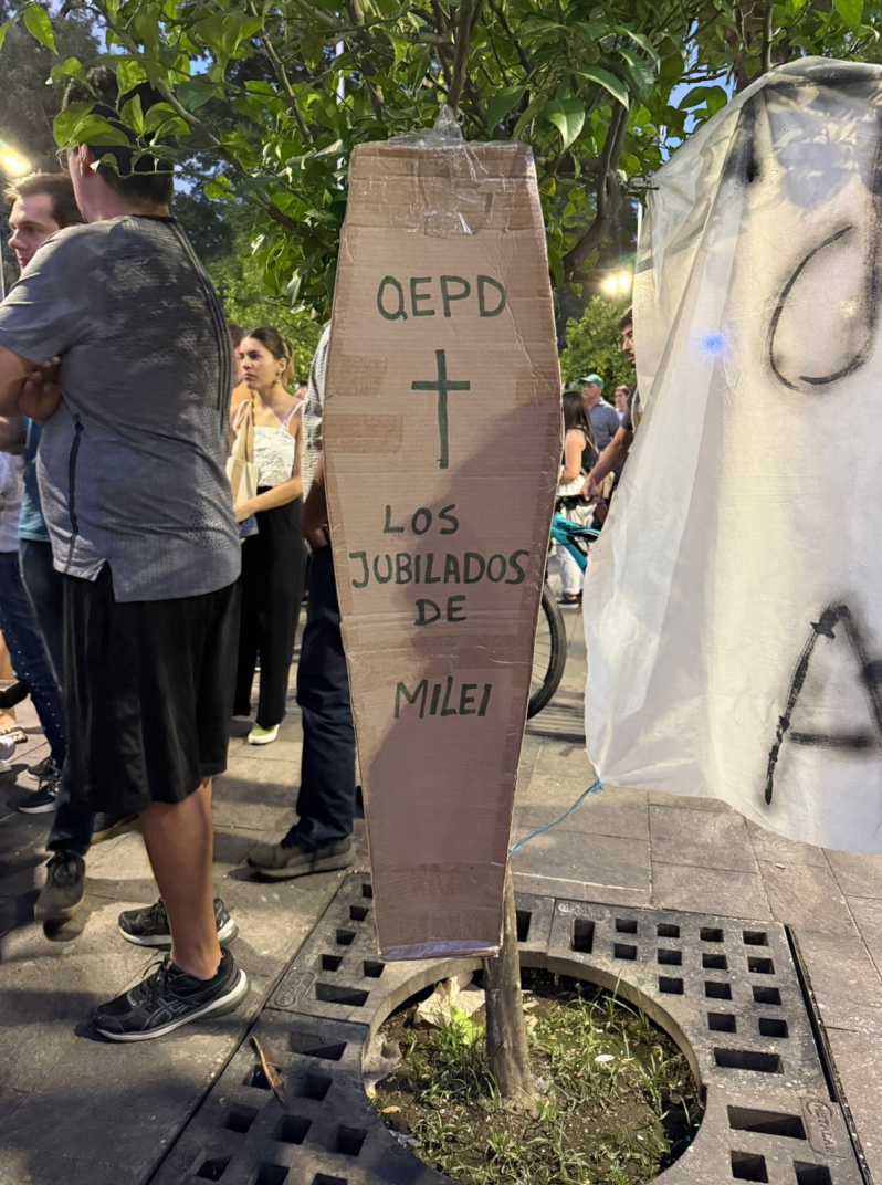 Pero además del repudio al negacionismo libertario, las consignas apuntaron a la crisis económica que sigue golpeando el bolsillo de las amplias mayorías. En la plaza se mezclaron las banderas clásicas de derechos humanos con carteles que apuntaban directamente al ajuste del gobierno y la situación de los trabajadores. En Tucumán, instalaron un cajón fúnebre de cartón que velaban a los jubilados de la era Milei.
